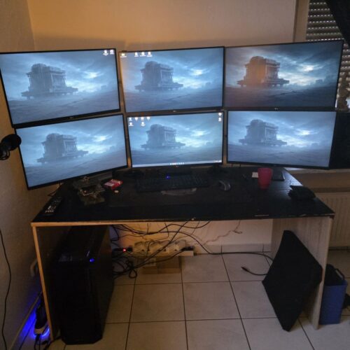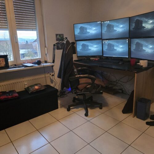 Arbeitstisch, Monitorarme, Boxen und Kabelmanagement: alles sichtbar und unverfälscht. Hier erkennt man, wie der Raum ohne Effekte funktioniert – als reiner Arbeitsraum.