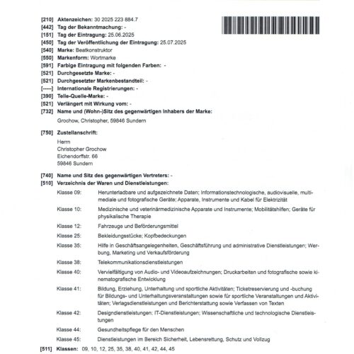 - Markenregistrierung Beatkonstruktor in 11 Waren- & Dienstleistungsklassen