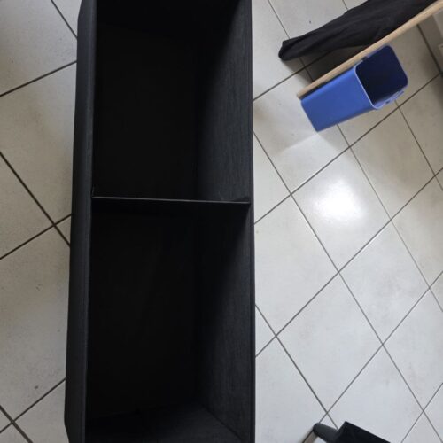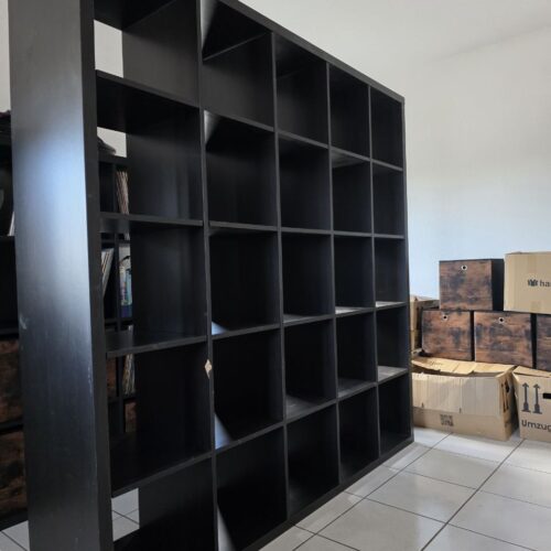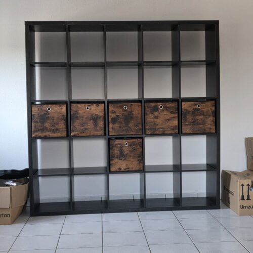 Kallax-Module, kleine Tische, Werkzeugkisten. Noch alles verteilt, alles unruhig. Die Phase, in der man spürt: Jetzt beginnt der Aufbau.
