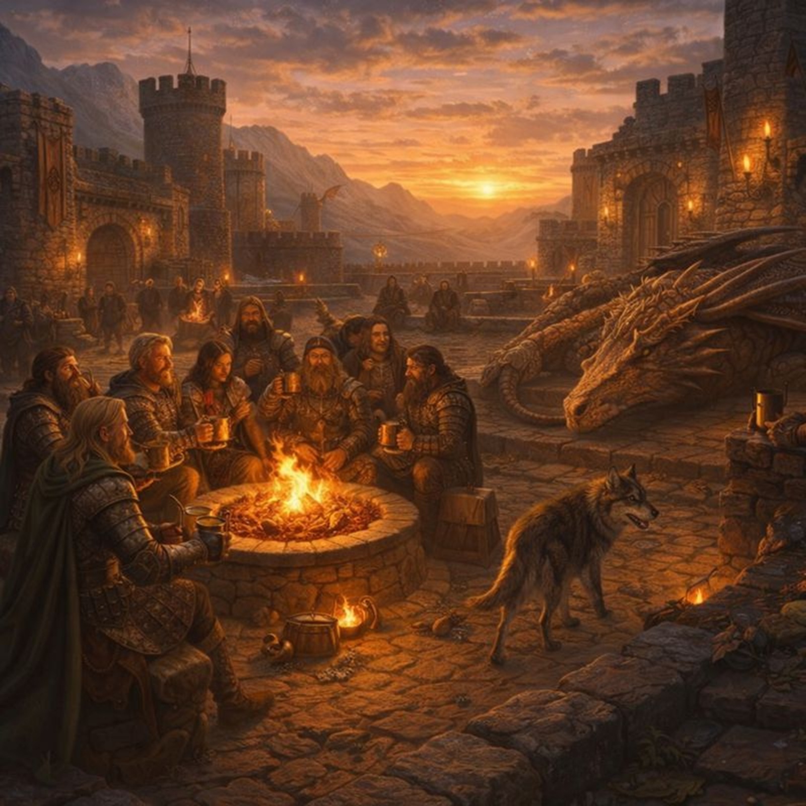 Der mächtige Wolf, Begleiter seit den frühen Tagen der Reise, trottete zwischen den Versammelten umher. Kinder streichelten sein dichtes Fell, während er wachsame Augen über das Fest schweifen ließ. Der große Drache, einst Schrecken der Lüfte, lag nun ruhig und zufrieden am Rande des Platzes. Seine Schuppen glühten schwach im Licht der Flammen – ein uraltes Wesen, das Frieden gefunden hatte.